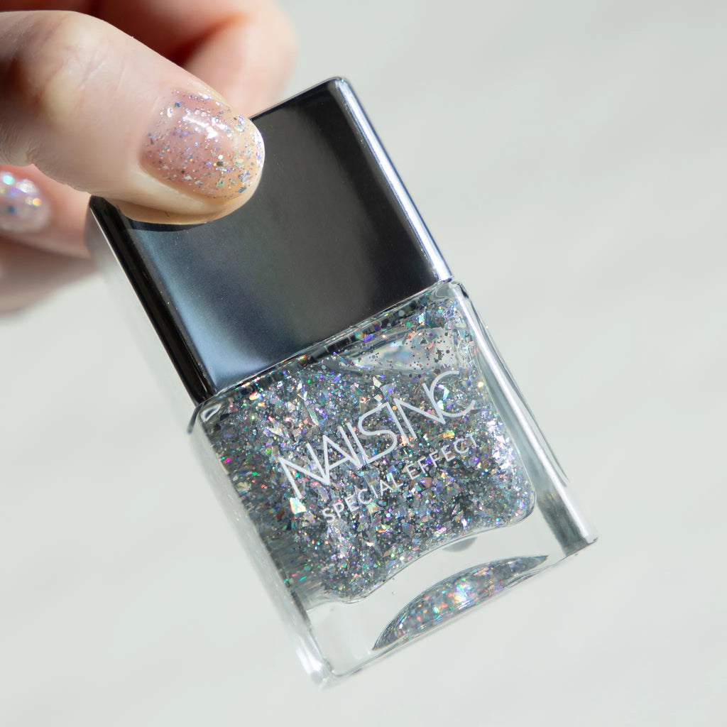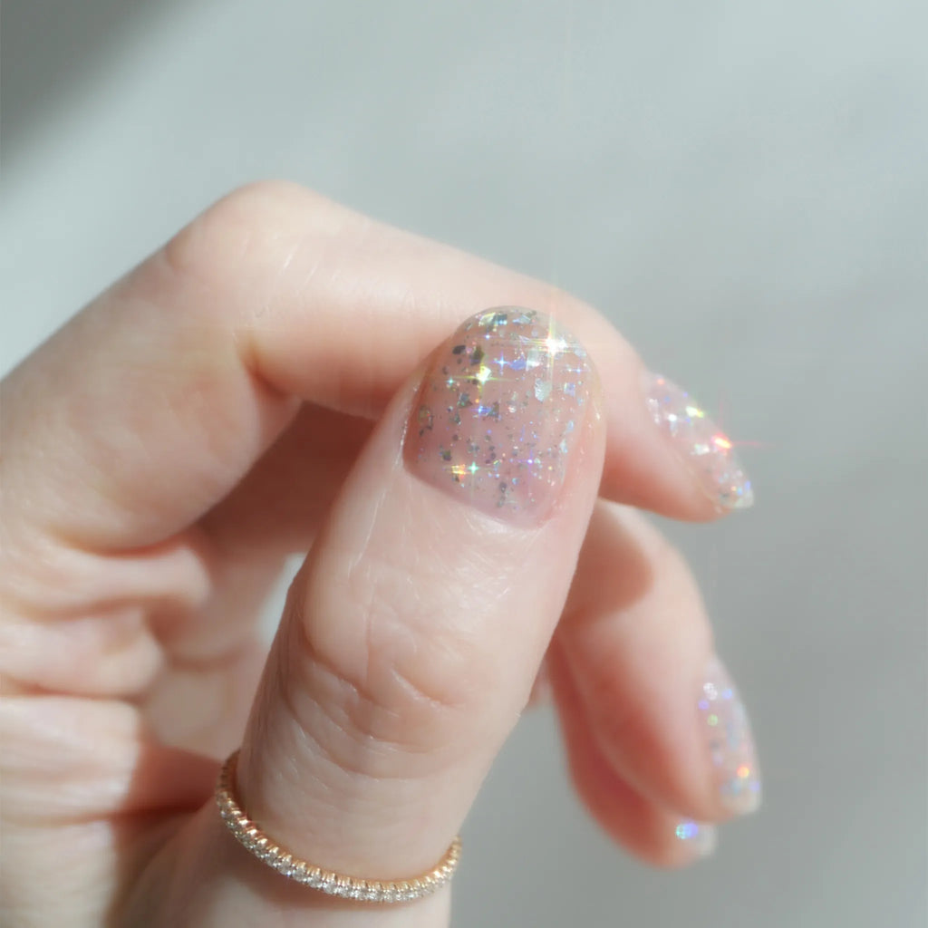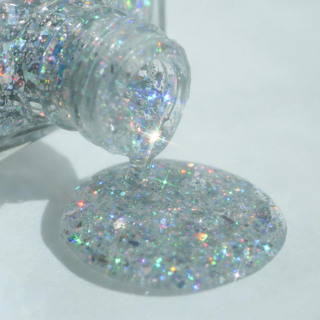 ランダムカットされたオーロラホログラムが指先から光が放たれているように煌めくグリッターカラー。
